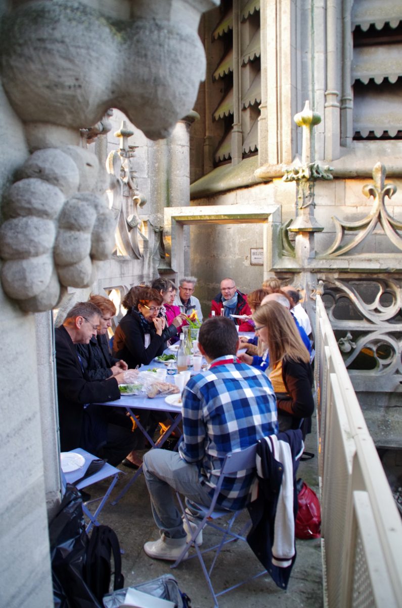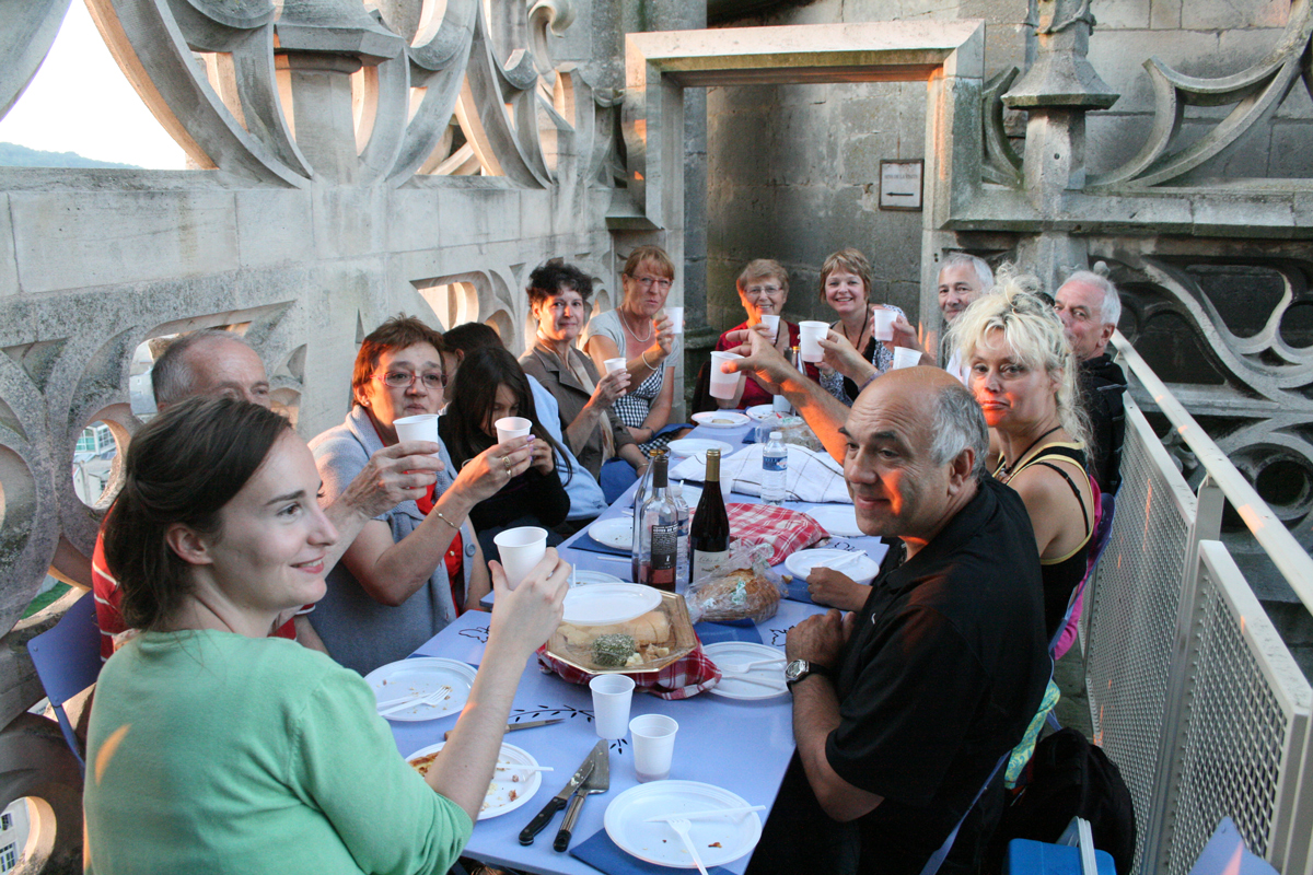 Chaque jeudi, vendredi et samedi, de juillet aux Journées du Patrimoine, la Cathédrale est l’hôte de courageux convives. Affamés et avides d’Histoire et de bons mets, la quinzaine de convives partent à l’ascension des 325 marches de la tour sud de la Cathédrale à la suite d’un guide. Chargés des sacs du repas, armés de leur lampe de poche, les grimpeurs vont découvrir la ville et son patrimoine à 60 mètres avant de partager le casse-croûte un peu plus bas, entre les deux tours.